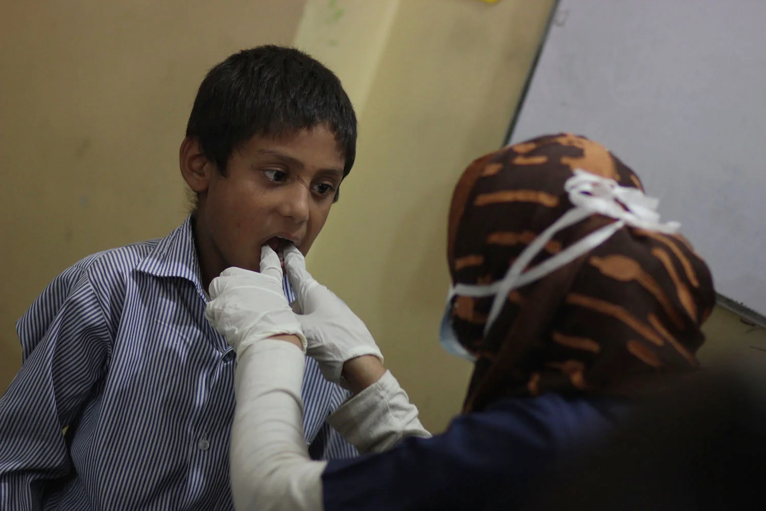 Dr. Razzak conducting an oral exam during Barkat's free health camp conducted at Rising Star School for underpriviledged children in Lahore.
